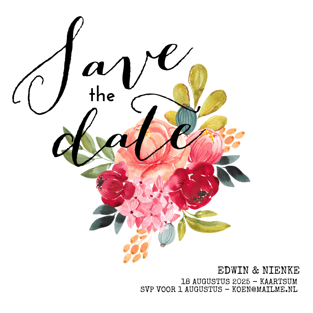 Jullie gaan trouwen, hoera! Save the date met deze stijlvolle, vierkante kaart met een vrolijk bloemenboeket en sierlijke letters. Maak hem af in de online editor!