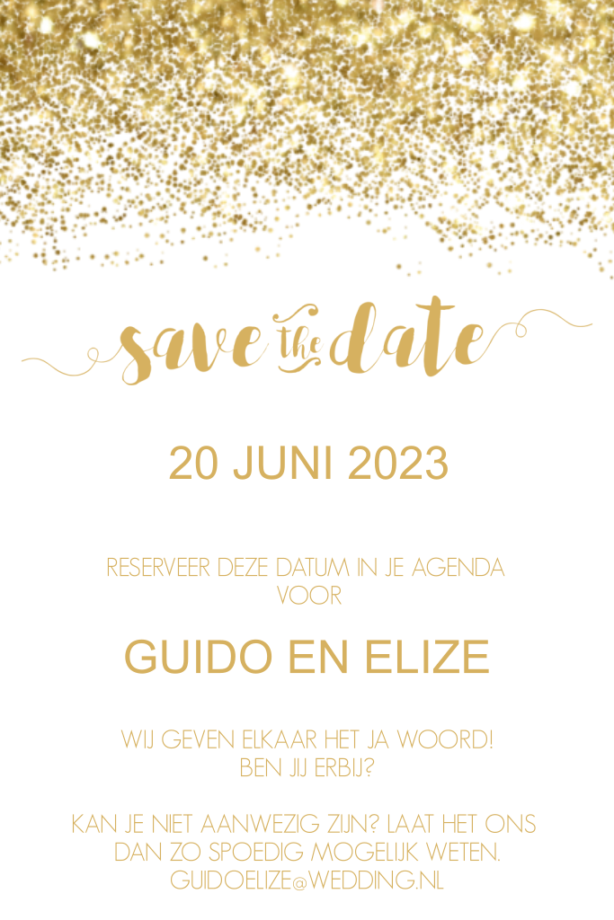 Wat een feestelijke save-the-date-kaart met deze goudkleurige glitters! In combinatie met de witte achtergrond heeft deze hippe kaart tegelijkertijd een stijlvolle uitstraling. Wanneer is jullie bruiloftsfeest?