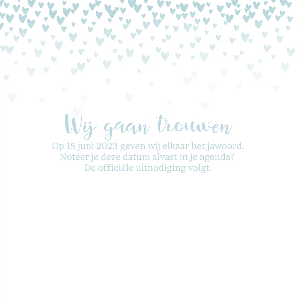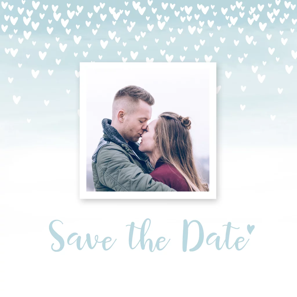 Een hartjesregen op je save-the-date-kaartje, wat romantisch! Met een achtergrond van mintkleurige aquarel en ruimte voor een persoonlijke foto op de voorkant is deze kaart helemaal compleet.