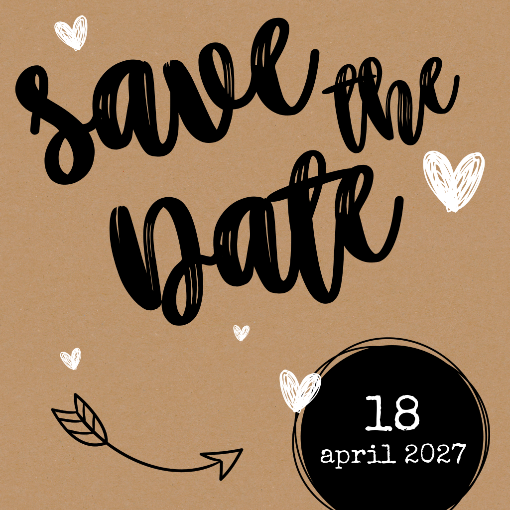 Stoere save-the-date kaart met handgeschreven tekst en witte hartjes op kraft papier achtergrond. Wist je dat we een bijpassende trouwkaart aanbieden?