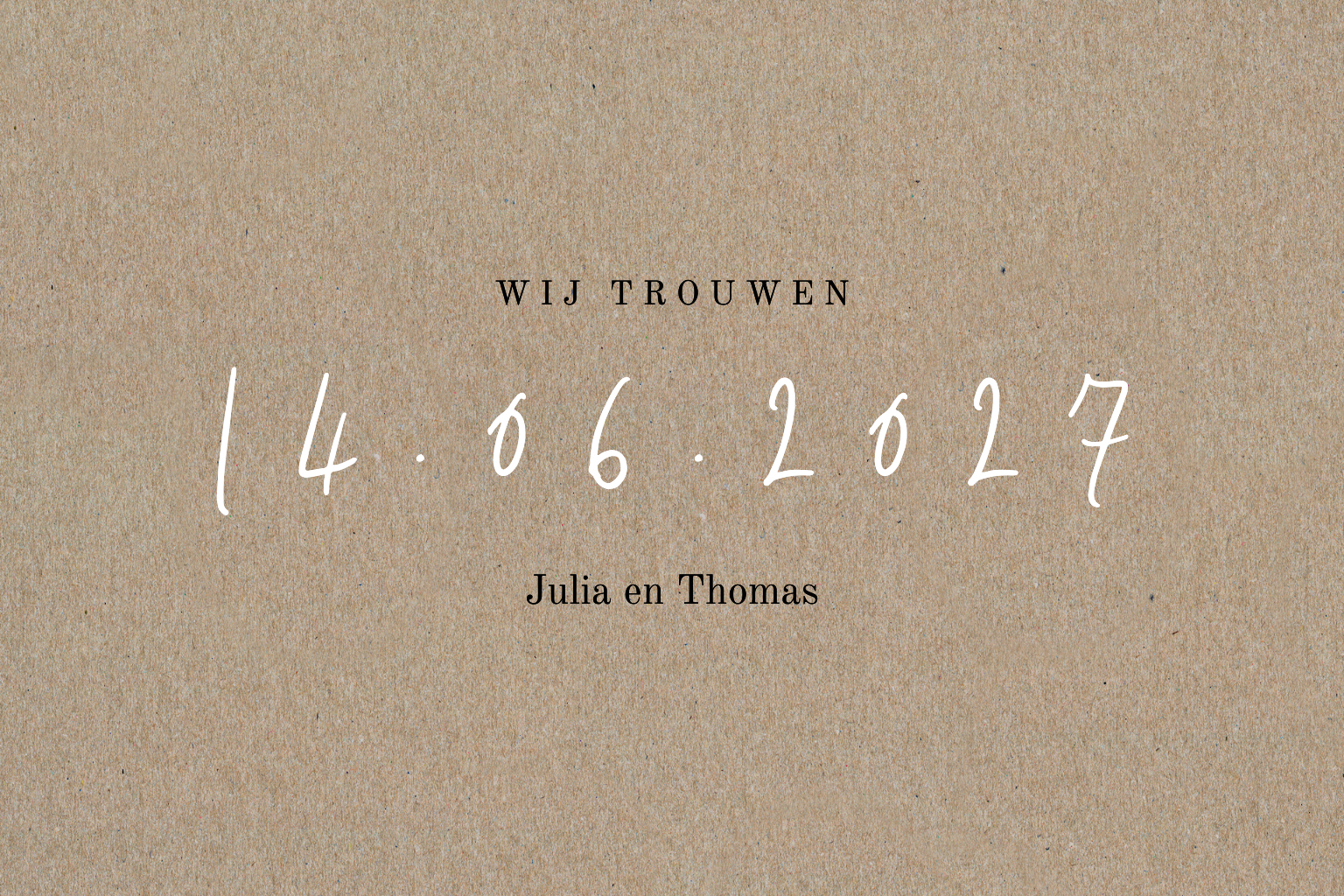 Eenvoudige save the date kaart van echt kraftpapier met moderne tekst in zwart en wit. In de online editor pas je de tekst gemakkelijk zelf naar wens aan.