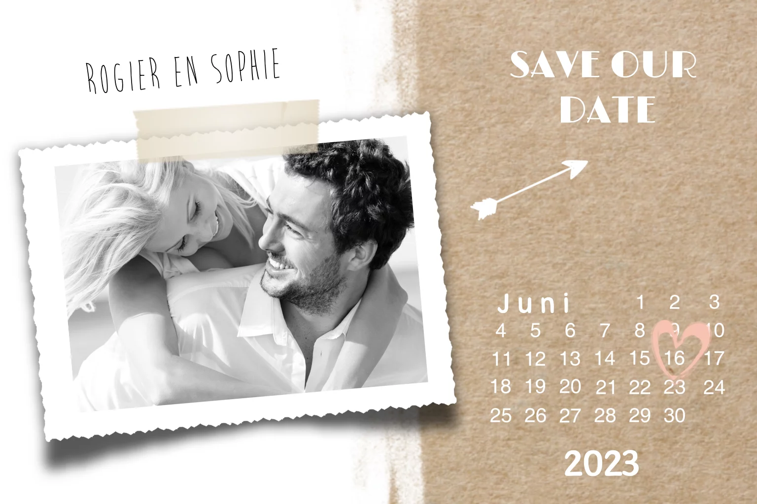 Hebben jullie al een datum uitgekozen? Leuk aan deze hippe save-the-date-kaart met zand op de achtergrond is de kalender met het hartje om de uitgekozen datum! Ook tof is het postzegelframe waarin je een persoonlijke foto kunt zetten. Tip: combineer dit kaartje met een kraftkartonnen envelop!