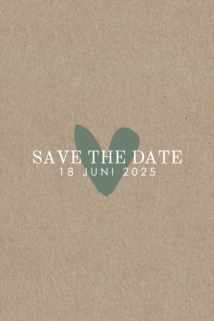Hippe save the date kaart van echt kraft en een groen hartje in het midden. De tekst is in modern lettertype in het wit en kan naar wens worden aangepast in de online editor.