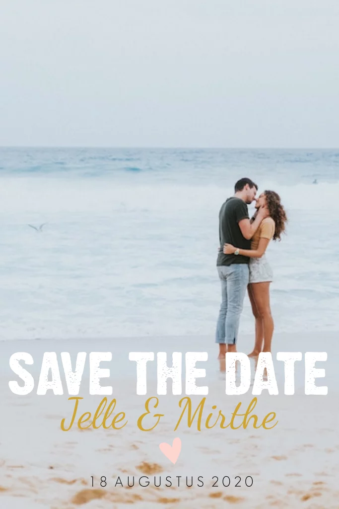 Hip enkel staand save-the-date-kaartje. Leuk aan dit hippe kaartje zijn de verschillende lettertypes die zijn gebruikt. Hier kun je zelf ook nog mee spelen in de online editor. Het roze hartje geeft dit kaartje iets liefs. Voeg een frisse foto toe van jullie samen en voilà!