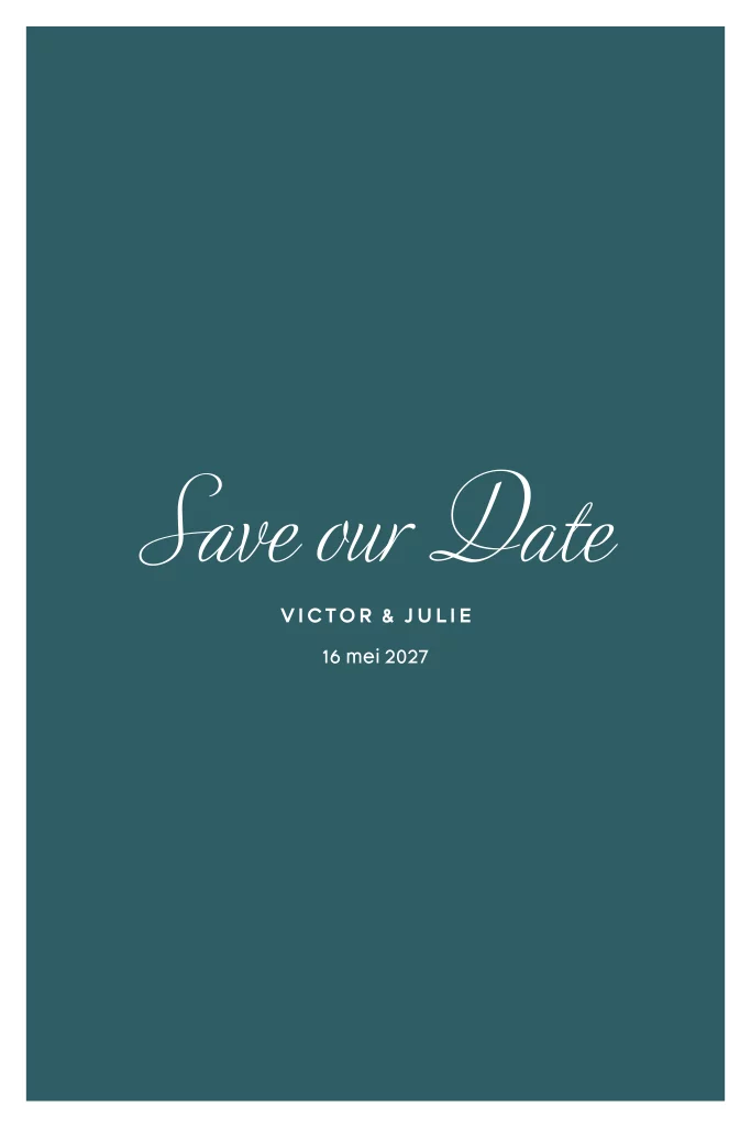Deze eenvoudige save the date kaart is uitgevoerd in petrolblauw / blauwgroen met een wit kader en sierlijke witte typografie. Juist door het simpele ontwerp komt de tekst mooi naar voren. Pas eenvoudig zelf het lettertype of kleur aan in de online editor, zo gedaan!