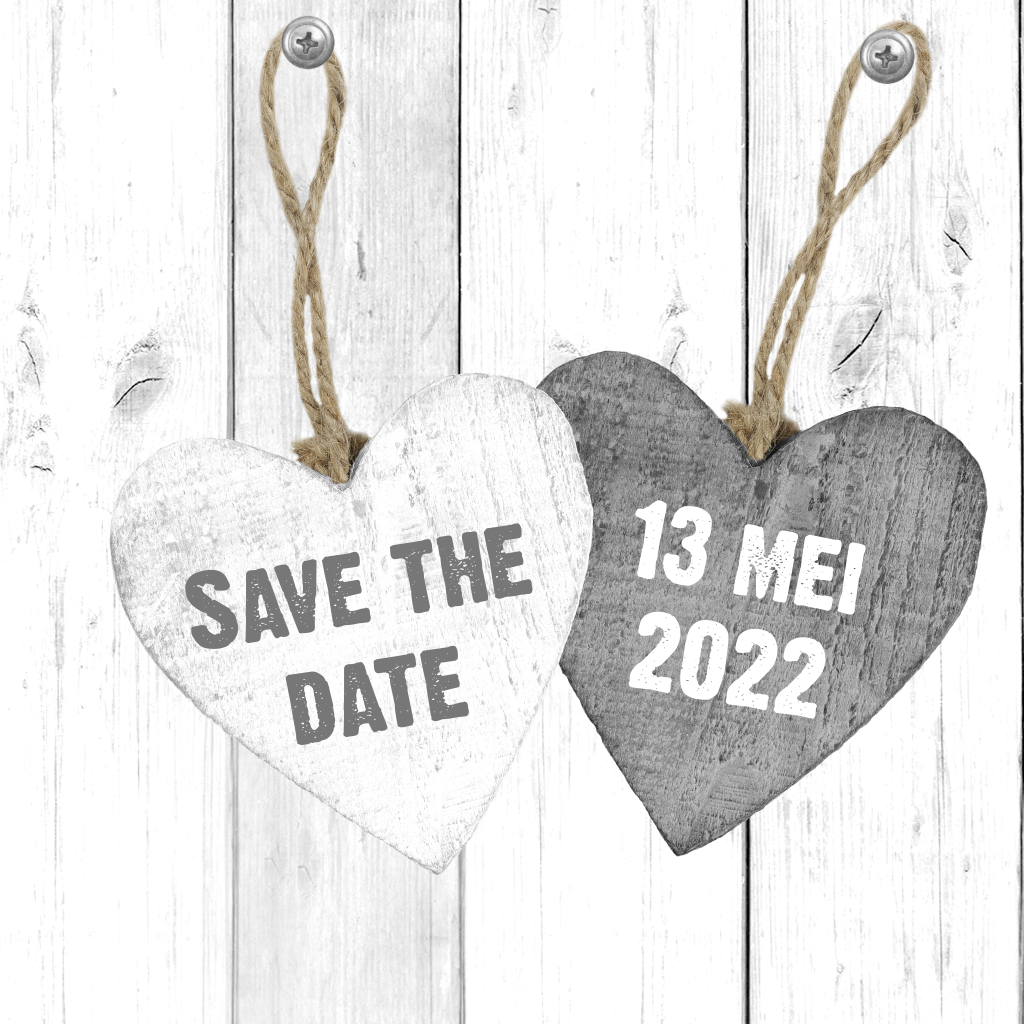 Ga je binnenkort trouwen? Stuur deze stoere Save the date naar je vrienden en familie om hen alvast te laten weten welke datum ze vrij moeten houden. Met houtlook hartjes op een houten achtergrond is dit kaartje echt hip!