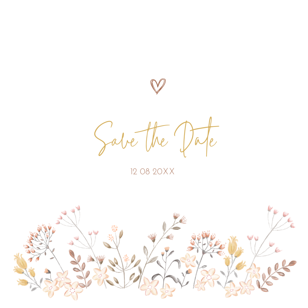 Botanische Save-the-date kaart met handgeschilderde bloemen in pastelkleuren, om jullie voorgenomen huwelijk aan te kondigen.