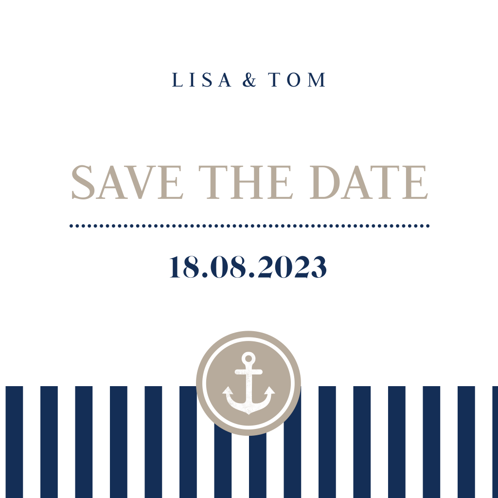 Een stoere streep in blauw/wit, klassiek anker en hippe typografie. Met deze Save the date kaart kun je het thema strand aangeven.