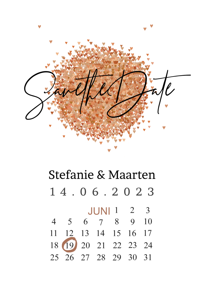 Save-the-date kaart met hartjes in koperkleur en kalender
