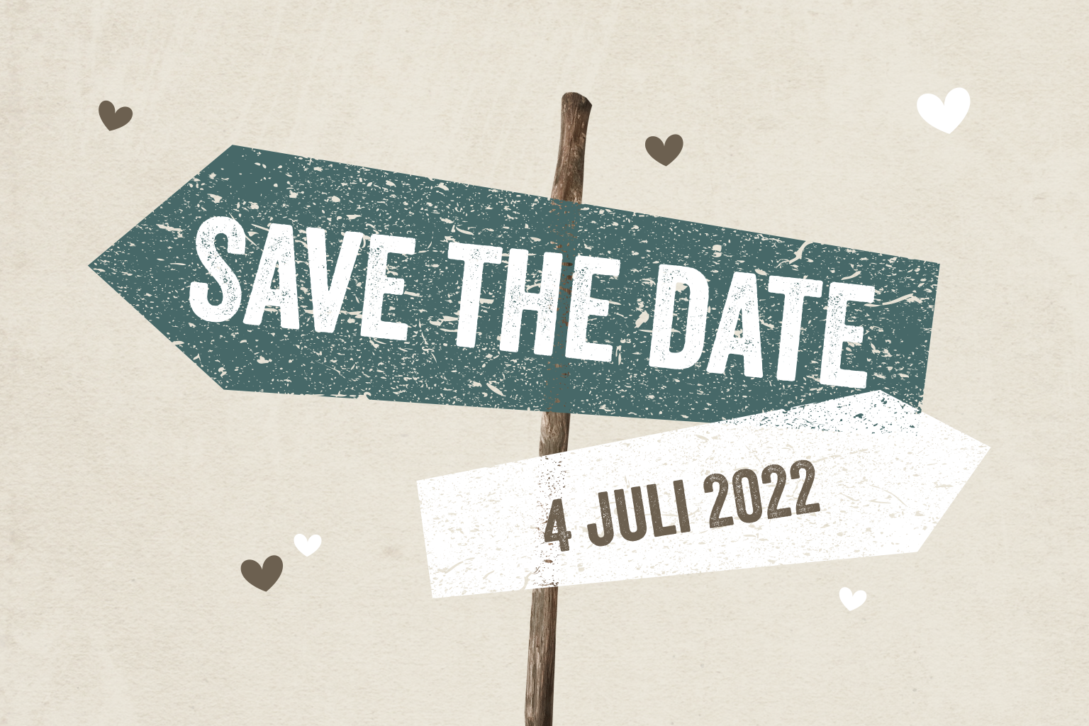 Houden jullie van stoer en simpel? Kies dan voor deze save the date kaart. Pas de informatie op de wegwijzer aan in de editor. Tip: kies voor oud-hollands papier.