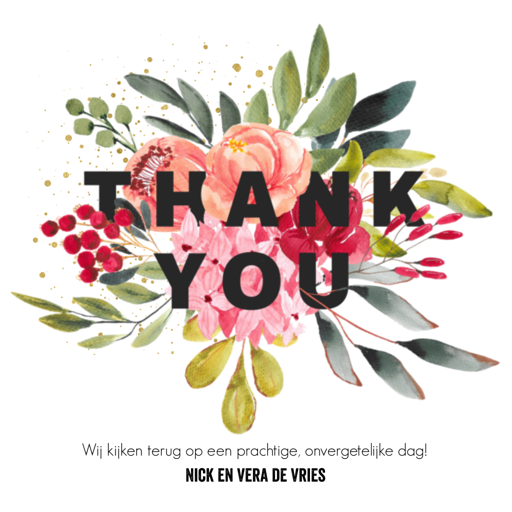 Een modern bedankkaartje voor de gasten van jullie bruiloft met een kleurrijk boeket en een stoer lettertype. De bloemen geven hem een vrolijke uitstraling. Thank you!