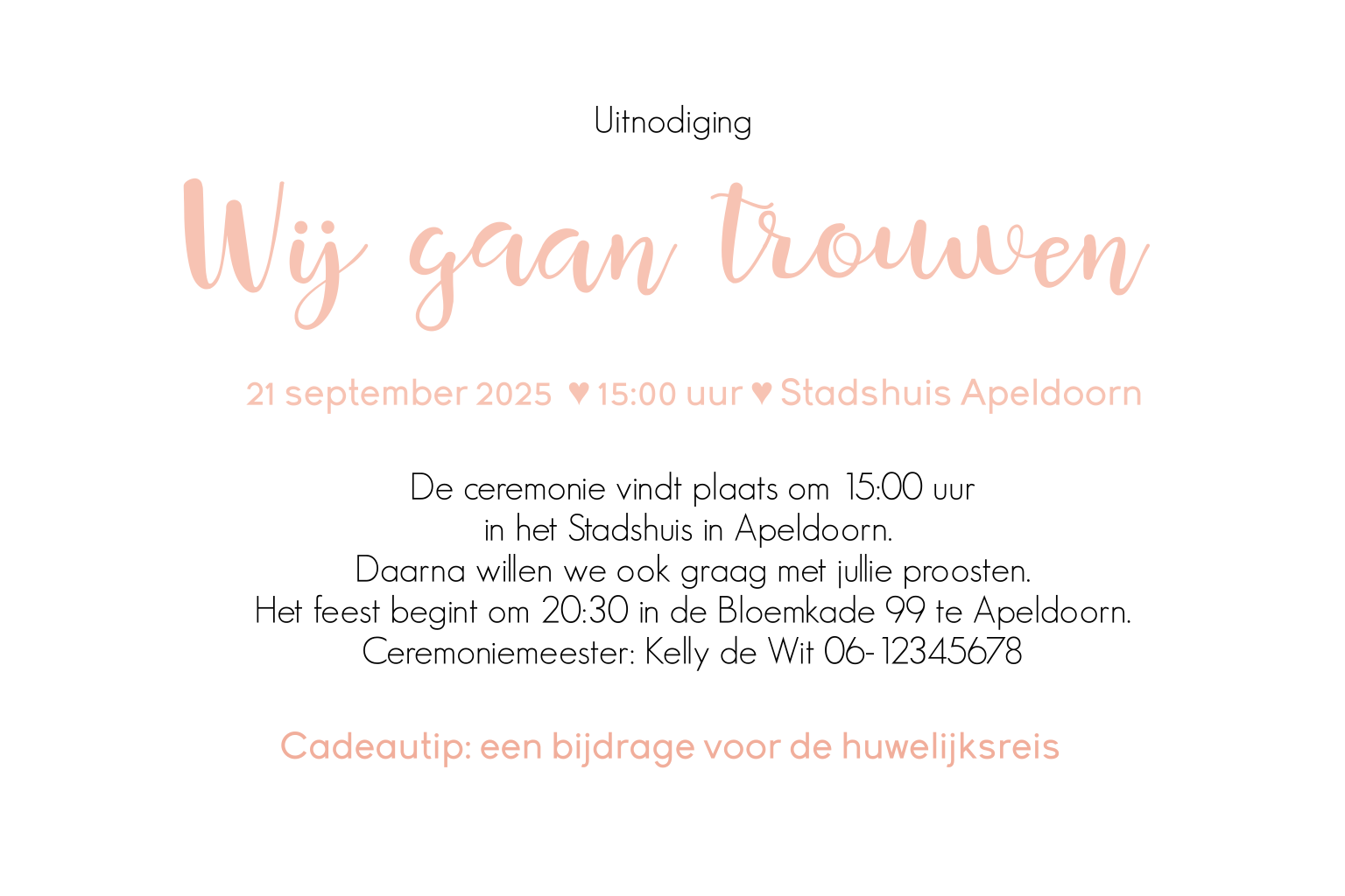 Romantische uitnodiging voor jullie trouwdag met ruimte voor een grote foto op de voorkant. Plaats je eigen foto en maak de trouwkaart persoonlijk met je eigen tekst.