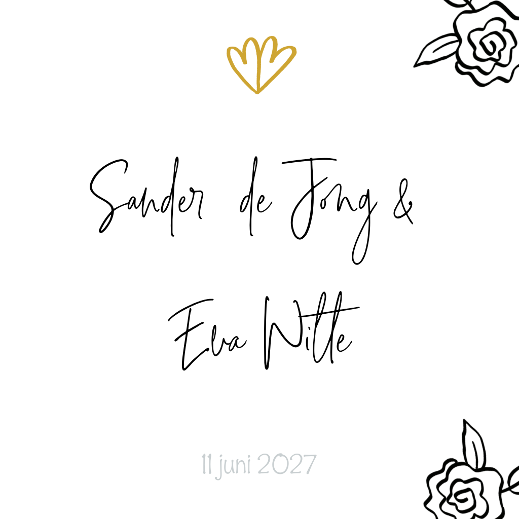 Stoere trouwkaart met getekende takjes, wijnglazen, rozen en hartjes. Verander de kleuren en maak het kaartje helemaal eigen.