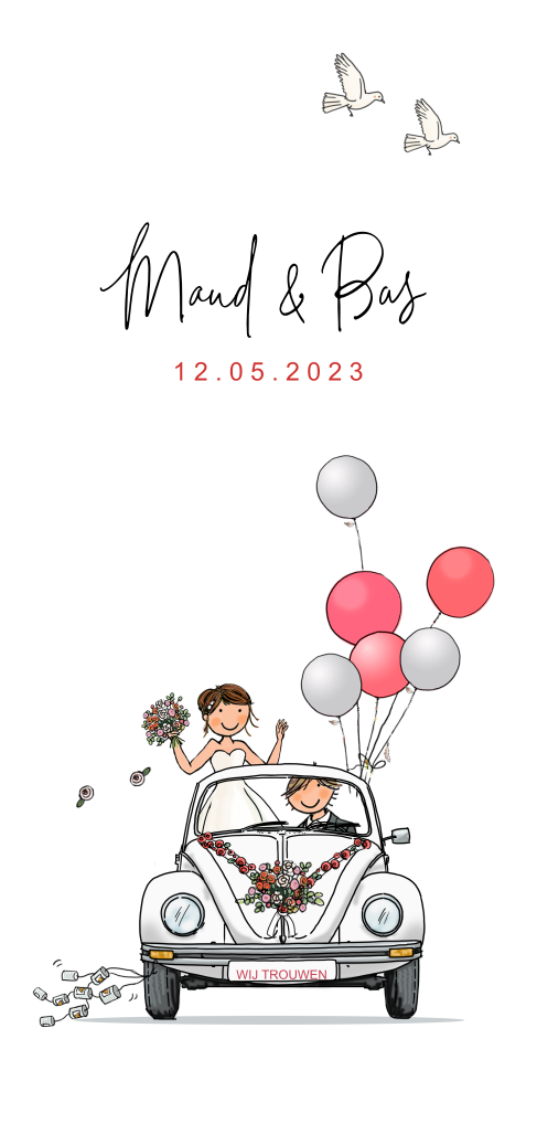 Langwerpige trouwkaart met tekening van bruidspaar in een witte kever. Zowel op de voorkant als achterkant staan witte en roze ballonnetjes. Verplaats de afbeeldingen of verander de kleuren in de editor naar eigen wens!