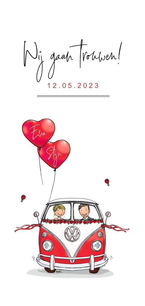 Grappige trouwkaart in langwerpig formaat met tekening van bruidspaar in een Volkswagen busje en rode ballonnen. Wil je liever andere kleuren of andere lettertypen? Verander dit gemakkelijk zelf in de editor en maak je trouwkaart helemaal naar eigen wens!
