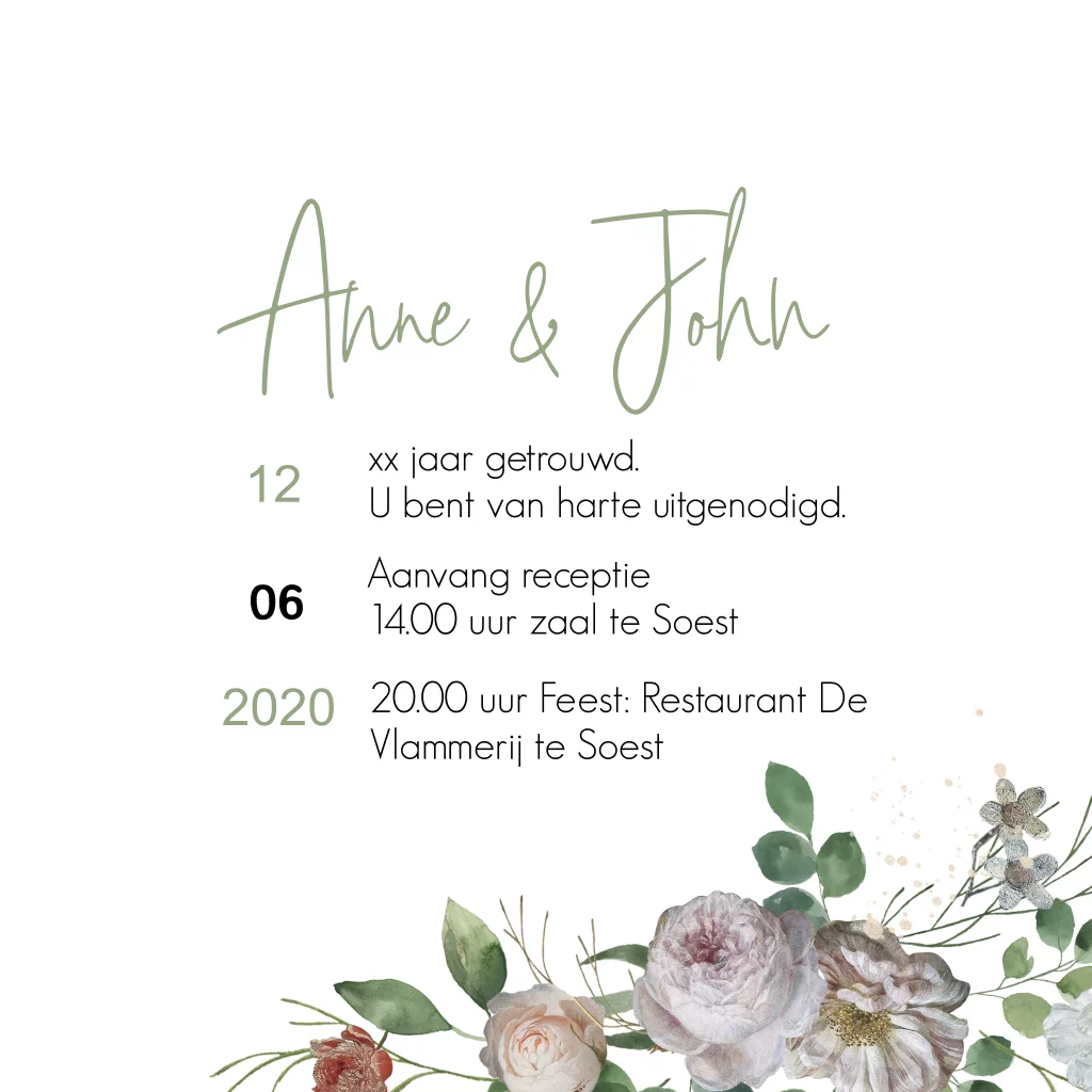 Geschilderde jubileumkaart met geschilderde bloemen. Zo lijkt deze jubileumuitnodiging op een persoonlijk geschilderde canvas voor je familie en vrienden.
