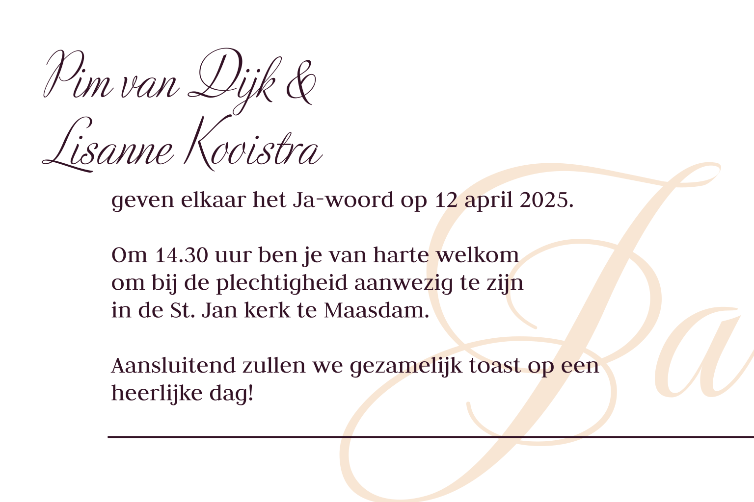 Een klassieke uitnodiging voor jullie bruiloft met in groot het woord Ja. Kies je favoriete kleur en pas de tekst eenvoudig aan. Mooi op parelmoer papier met bijpassende envelop.