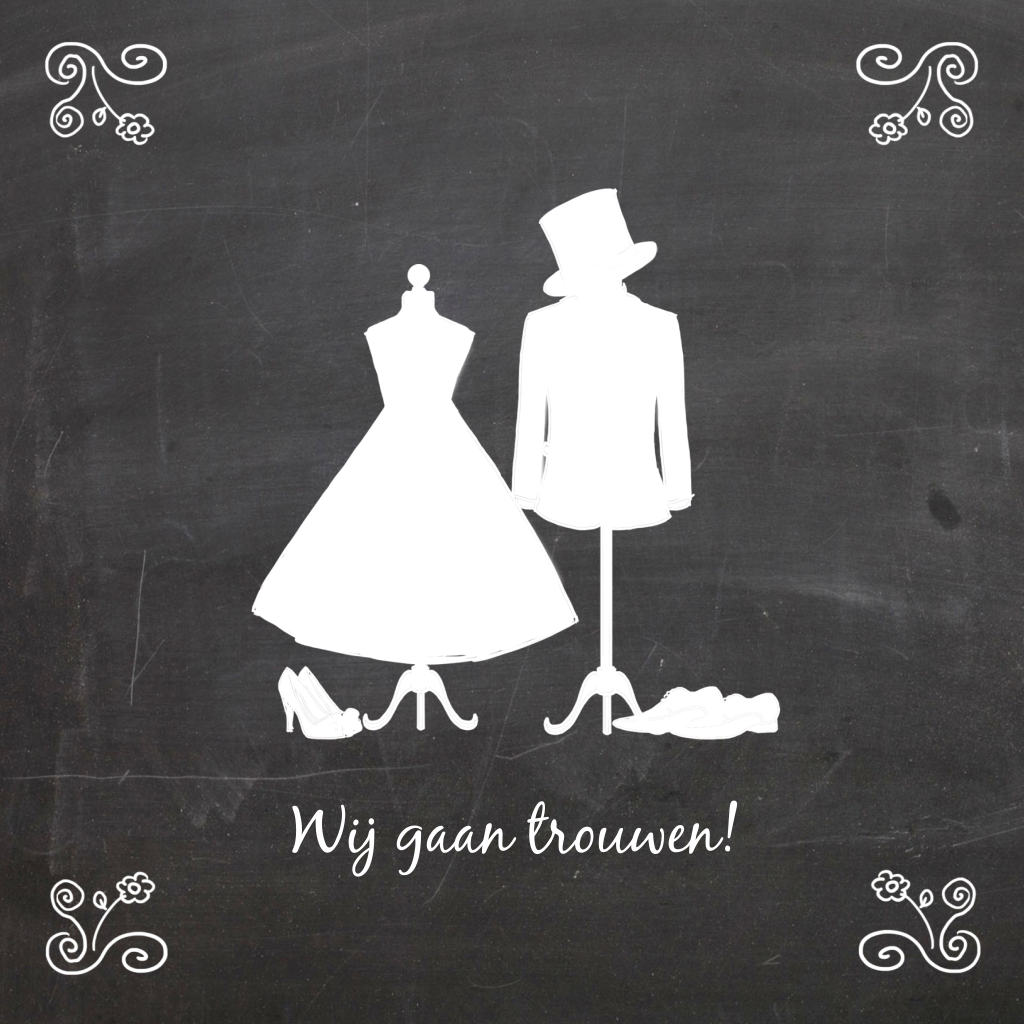 Leuke trouwkaart met de illustratie van een trouwjurk en kostuum in wit op een krijtlook achtergrond. De tekst kan naar wens aangepast worden.