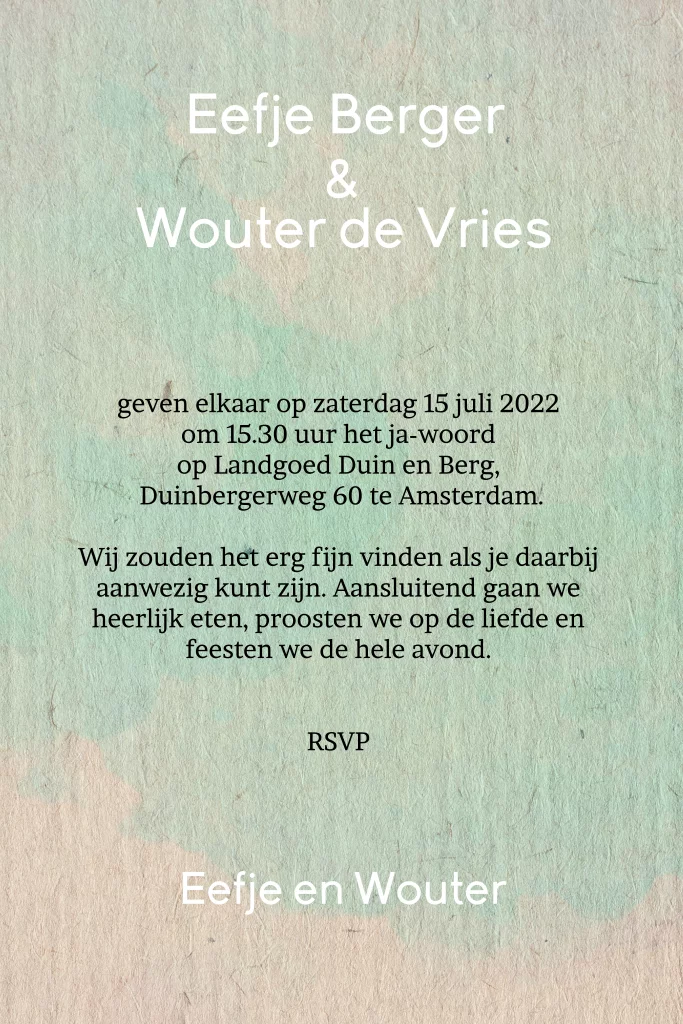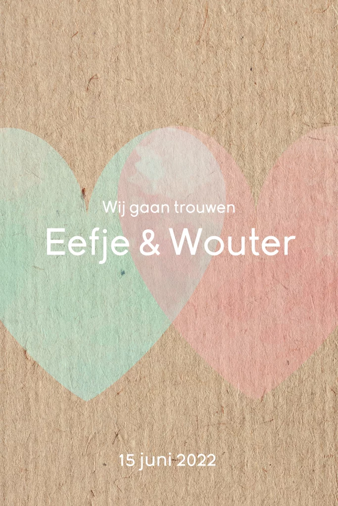 Hippe trouwkaart met twee versmolten watercolourharten in mintgroen en warmroze. De watercolour komt ook aan de binnenkant weer terug. Met de geribbelde achtergrond van kraft is dit echt een originele kaart!