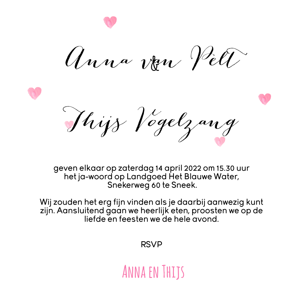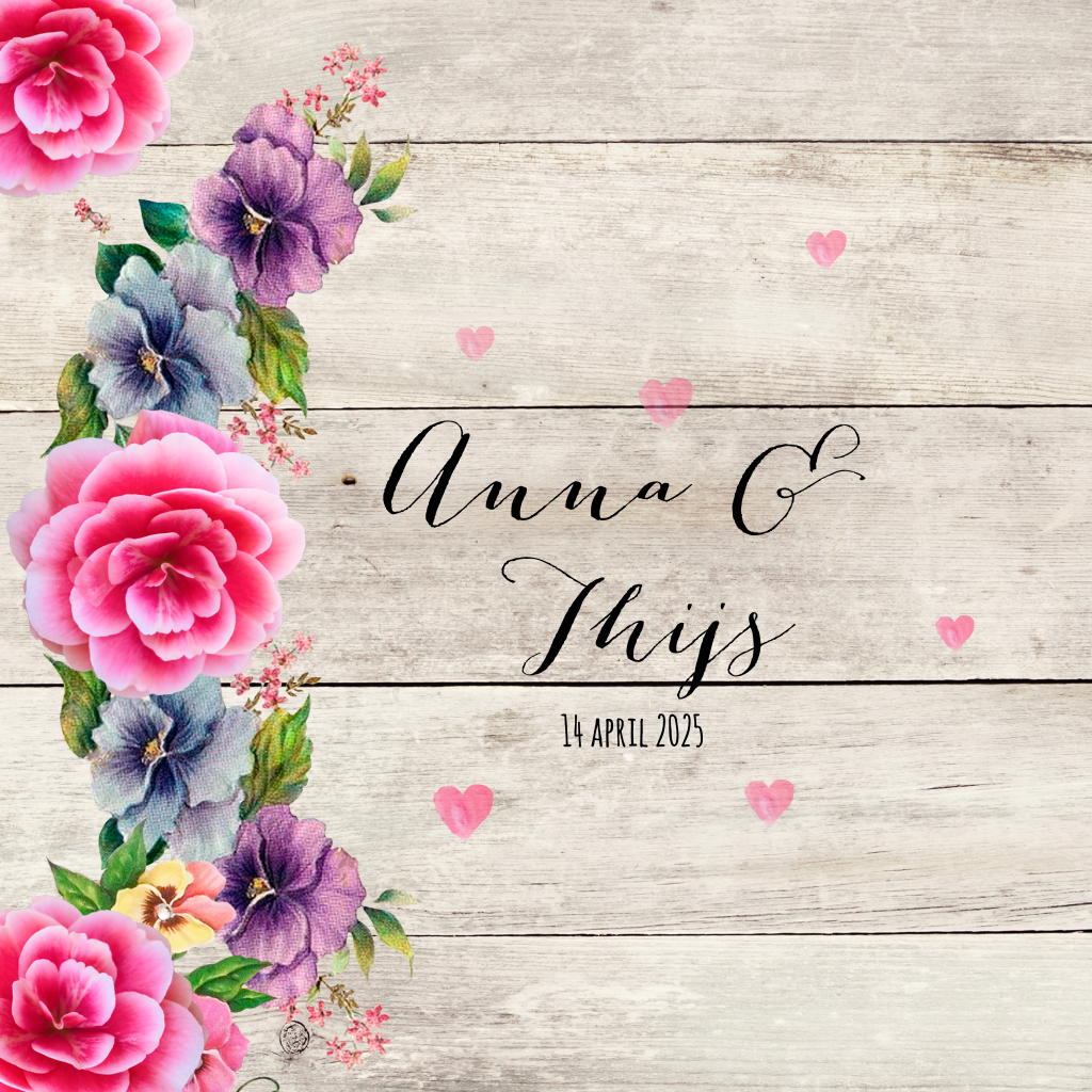 Romantische trouwkaart met kleurrijke vintage viooltjes en camelia's in roze- en paarstinten op een ondergrond van hout. Met de roze hartjes is hij helemaal compleet! Maak hier jullie eigen kaart van.