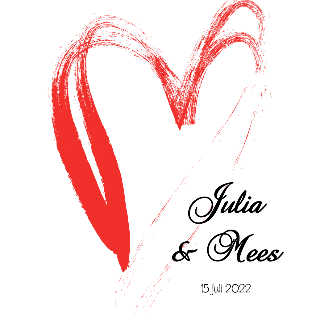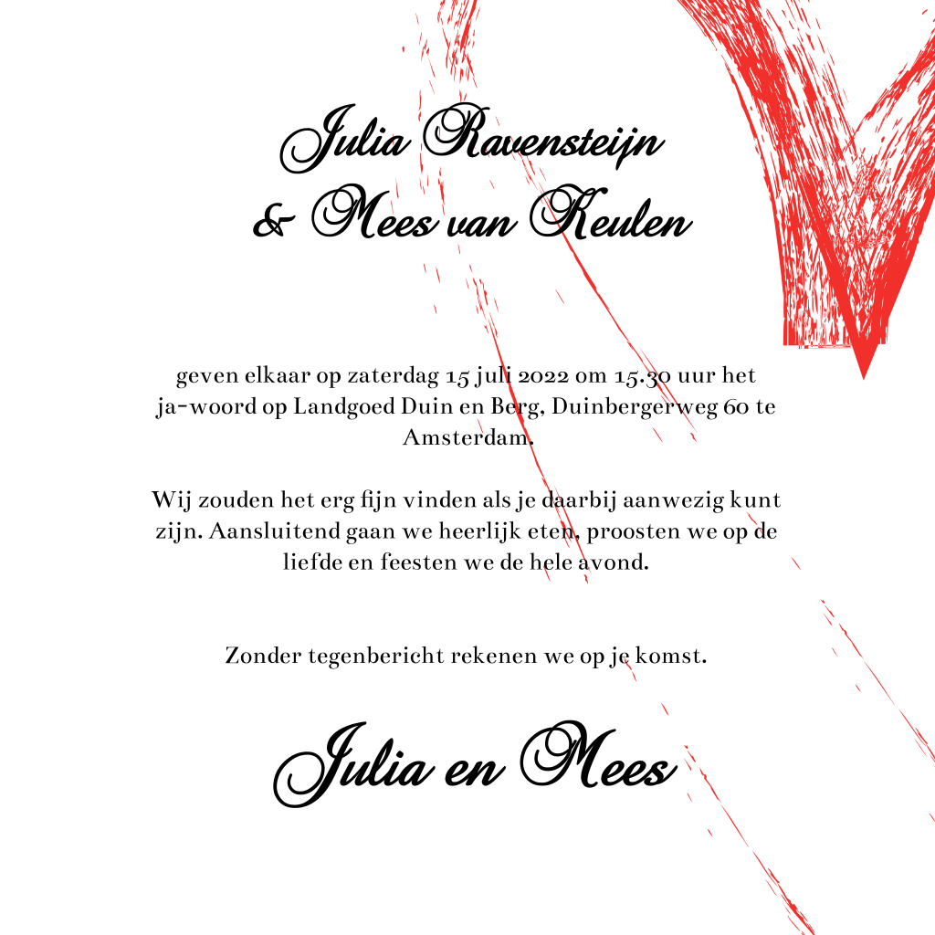 Een romantisch trouwkaartje met twee door elkaar geschilderde rode harten en een sierlijk lettertype. Pas de kaart naar eigen wens aan en bestel een proefdruk!