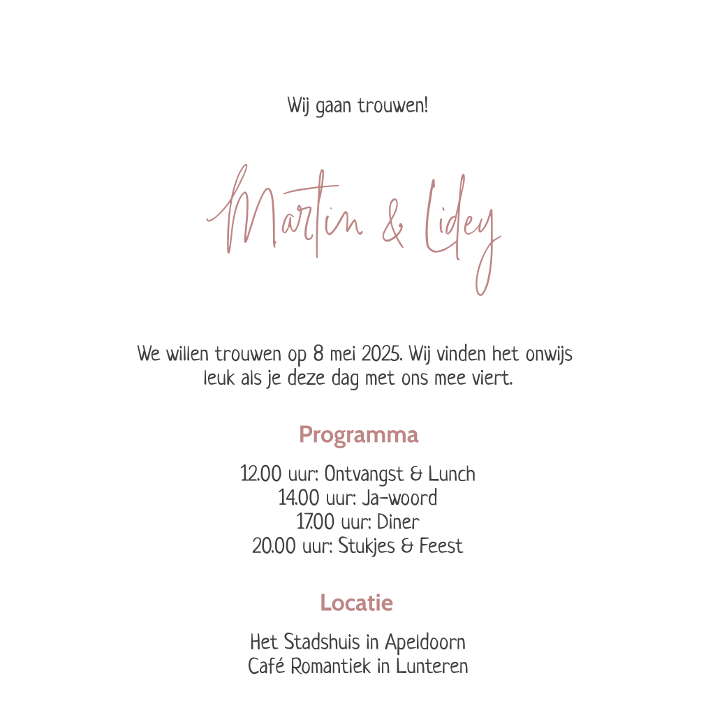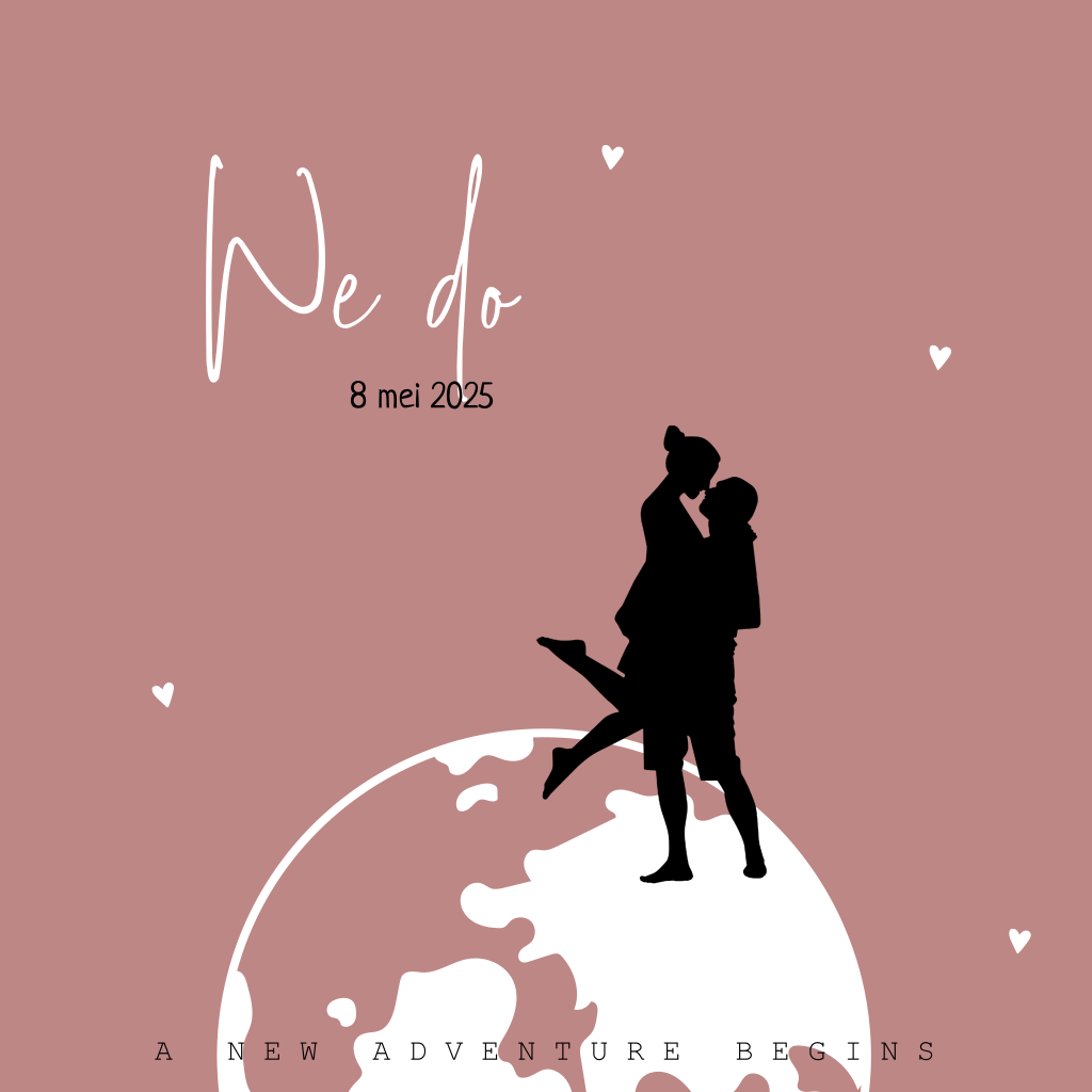 Hippe trouwkaart met koppel die op de wereld staat met lieve hartjes eromheen.