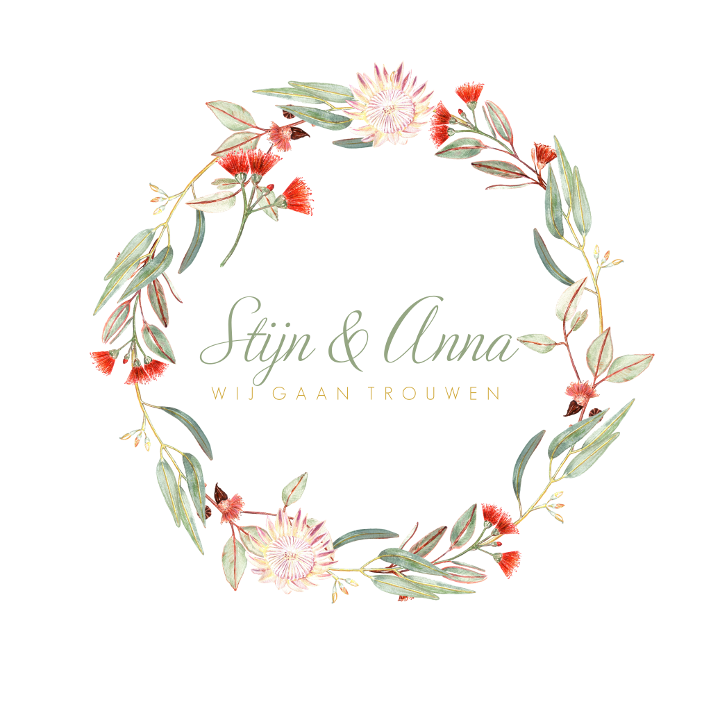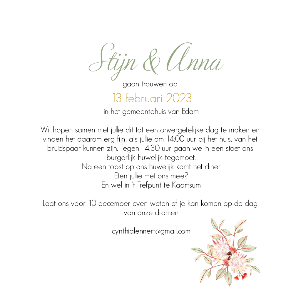 Stijlvolle en romantische trouwkaart met getekende krans van tropische bloemen en tekst in een chic lettertype op een witte achtergrond.