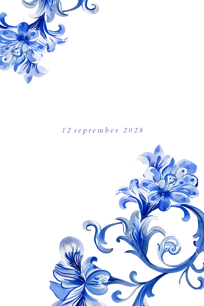 Stijlvolle trouwkaart met Delfts blauwe bloemen en tekst in goudfolie.
