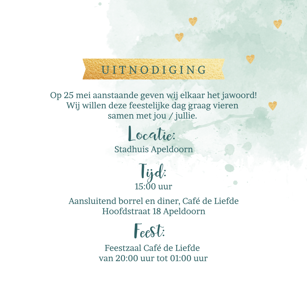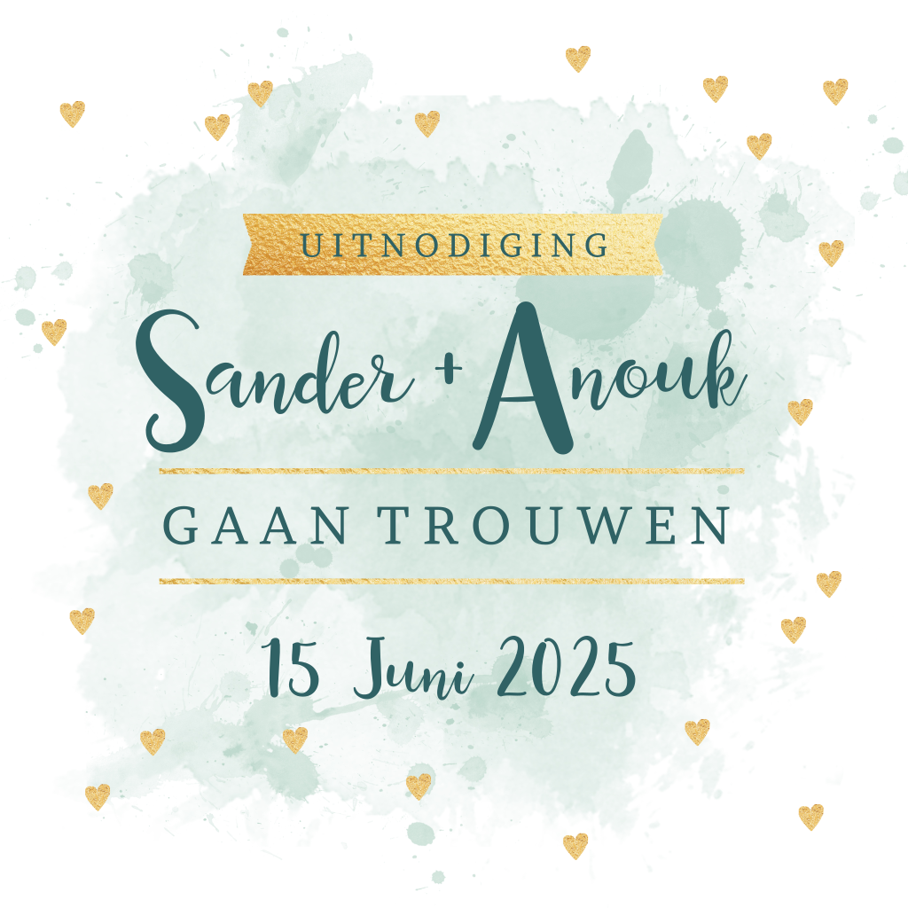 Allemaal goudkleurige hartjes op je trouwkaart, wauw! Ze geven hem in combinatie met de goudkleurige banner een lieve en chique uitstraling. Ook tof is de mintgroene achtergrond van watercolour. Wanneer zijn jullie trouwplannen?