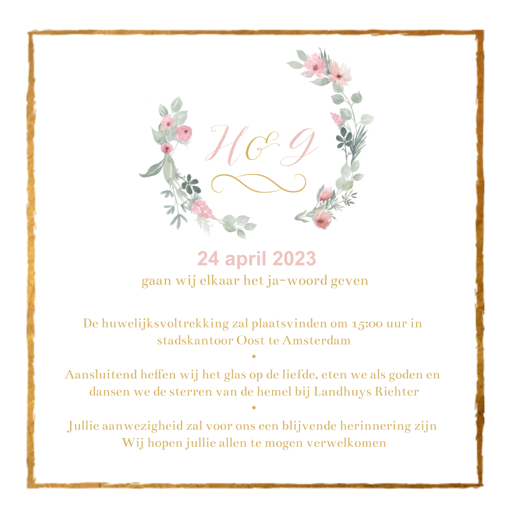 Deze stijlvolle trouwkaart in wit heeft een mooie combinatie van een strakke, goudkleurige rand en een sierlijk lettertype. Het bloemenboeket maakt hem feestelijk en fleurig!