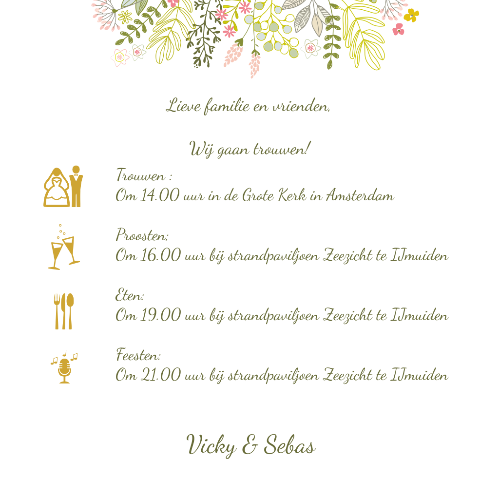 Wat een vrolijke trouwkaart met een naametiket omringt door bloemen en takjes! De achtergrondkleur kun je naar wens aanpassen. Ben jij ook fan van dit botanische kaartje? Maak hem dan zelf helemaal af!