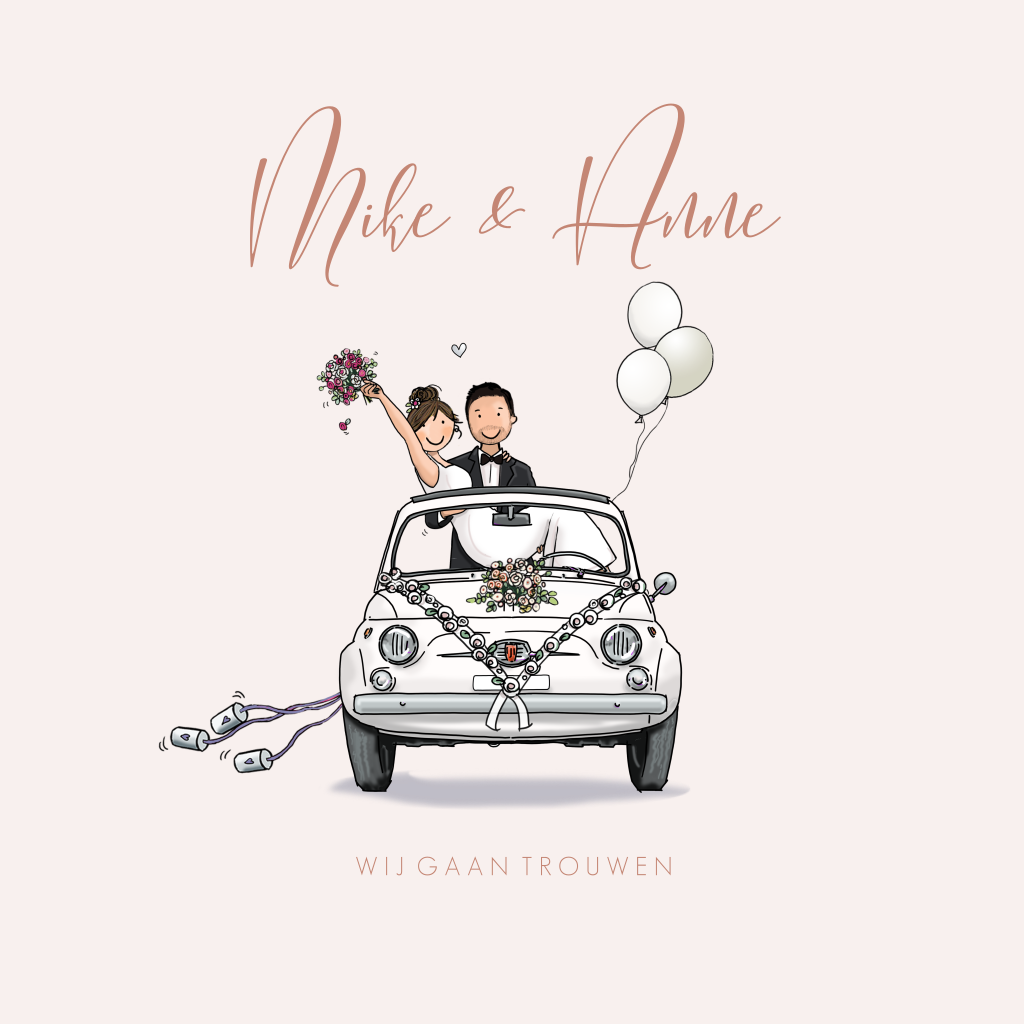 Wat een leuke uitnodiging om jullie huwelijksdag aan te kondigen! De bruidspaar staat in een leuke versierde fiat 500. Pas de tekst en de kleuren aan in de editor.