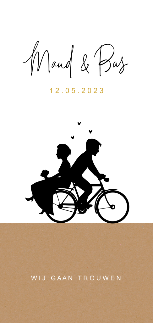 Stoere trouwkaart met bruidspaar op fiets en Kraft look
