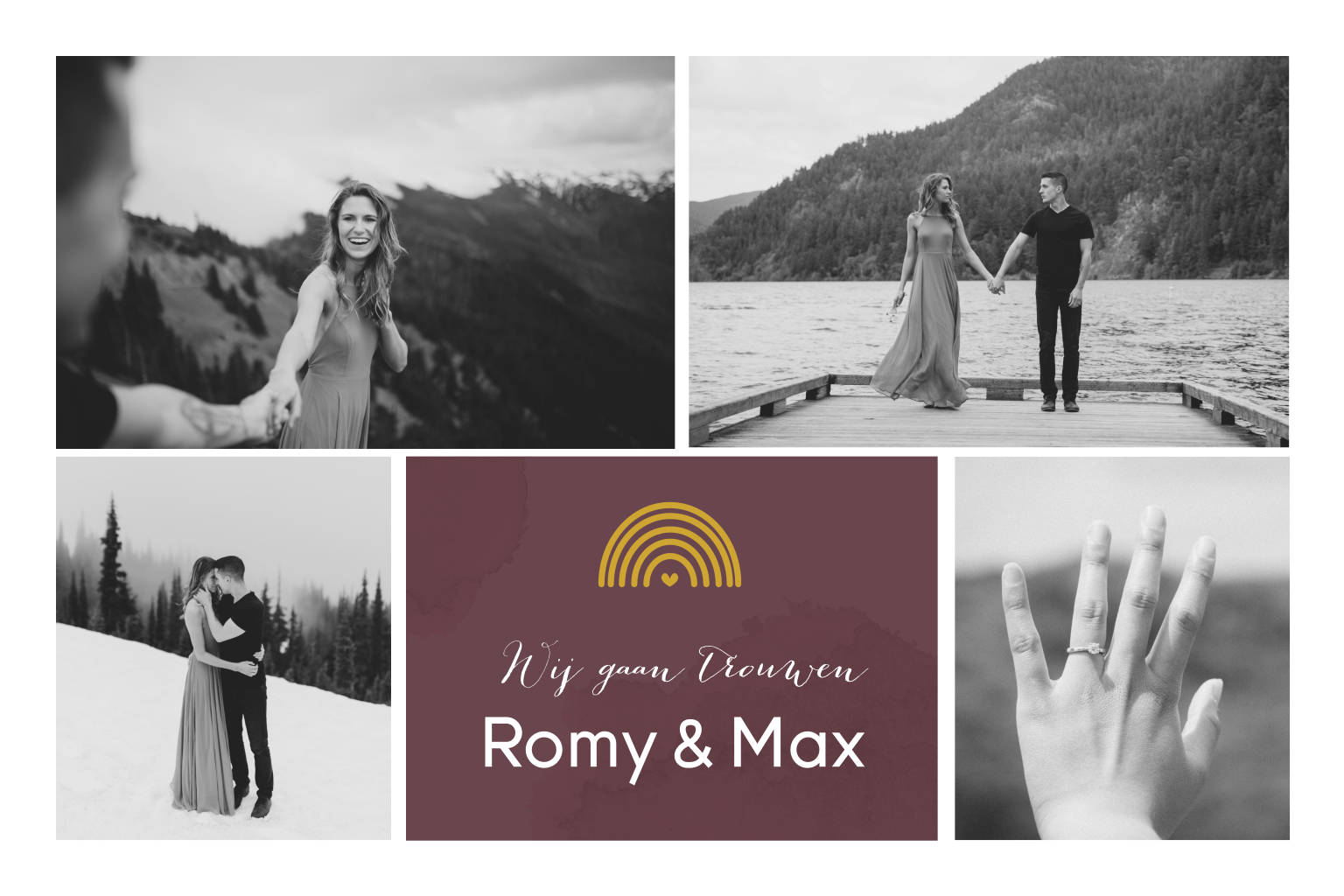 Chique trouwkaart met vier foto blokken waar je zelf foto's van jullie als koppel in kunt zetten. Het wijnrode vak met goudlook regenboogje maakt deze kaart echt hip!