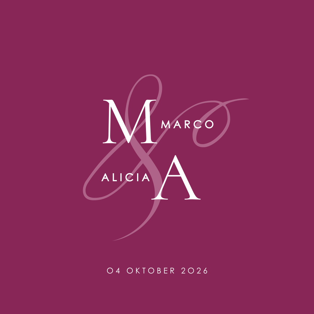 Chique trouwkaart met initialen in goudfolie op donkerfuchsia