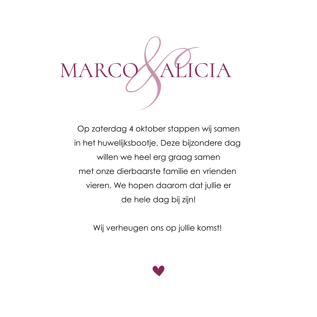 Chique trouwkaart met initialen in goudfolie op een fuchsia roze achtergrond. Pas de tekst naar wens aan in de online editor.