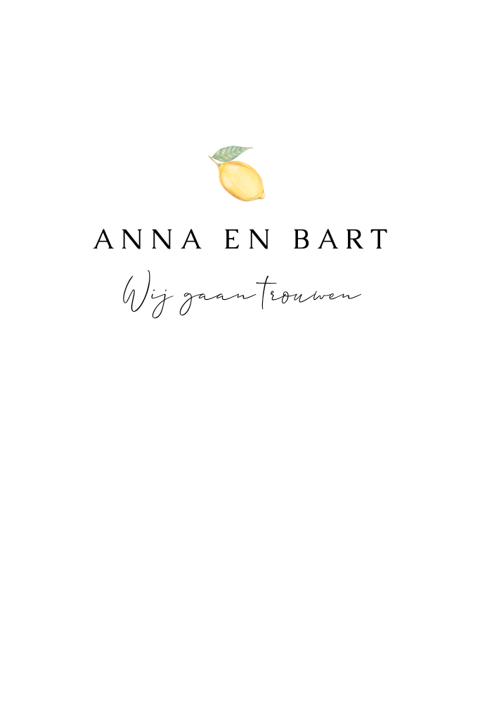 Hippe trouwkaart met leuk design van een citroentje! Op de witte kaart staan alleen de namen en 'wij gaan trouwen' met de citroen erboven. Op de achterzijde is ruimte voor de tekst van de uitnodiging en staan twee citroenschijfjes in de hoeken, zomers kaartje!