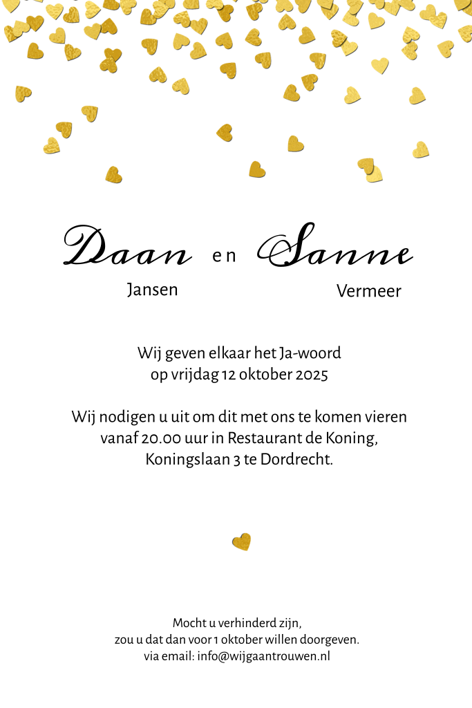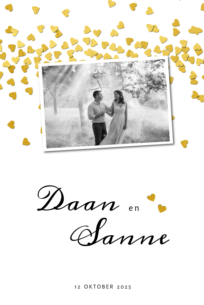 Stijlvolle trouwkaart met gouden hartjes met foto