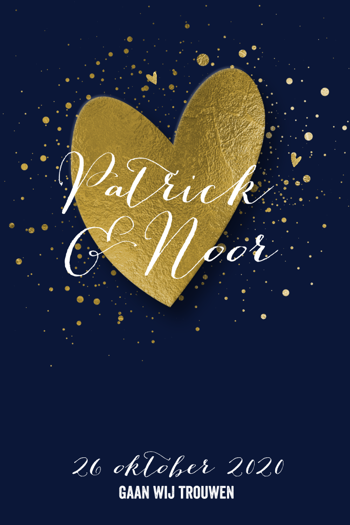 Een chique trouwkaart in marineblauw met een groot, goudkleurig hart en daaromheen kleine stipjes en hartjes. Oogt luxe! Teksten en lettertypes zijn naar wens aan te passen.