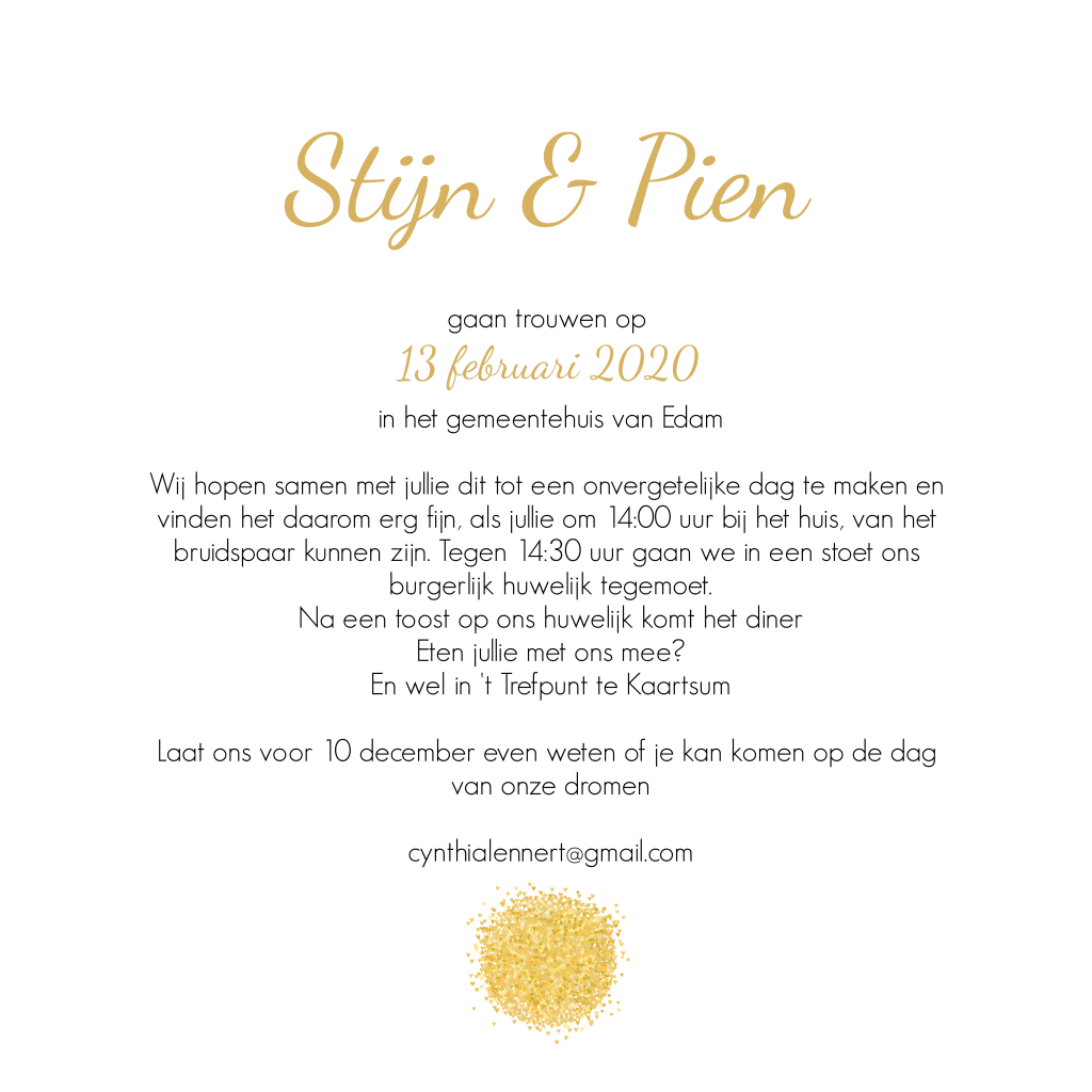 Wow, wat veel goudkleurige hartjes! Deze geven de trouwkaart een chique, feestelijk uitstraling. De tekst op de voorkant kun je ook een kleur geven. Pas dit naar wens aan in de online editor en maak hier jullie eigen trouwkaart van! Tip: Deze kaart heeft een bijpassende save the date kaart !