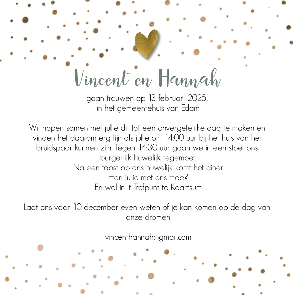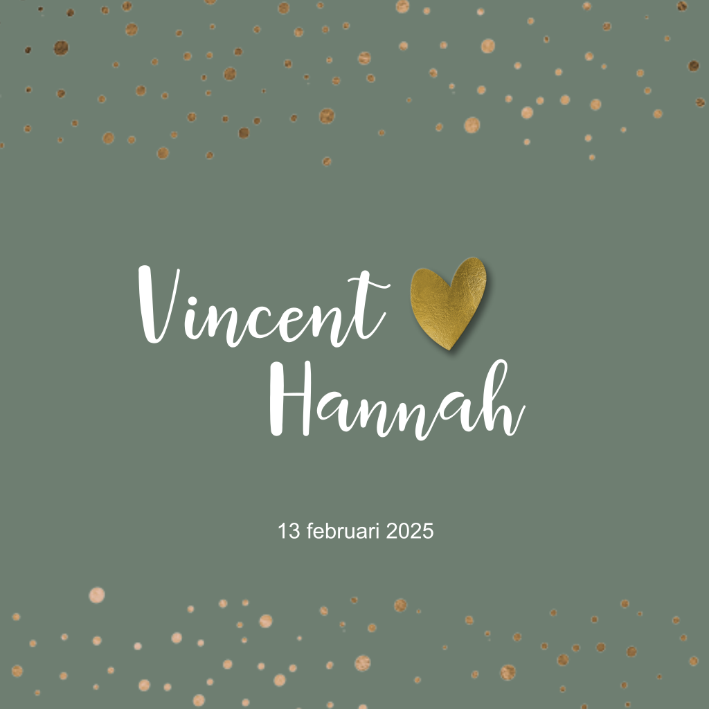 Een hip trouwkaartje in groen met feestelijke, goudkleurige stippen en een mooi hartje. Kleuren en lettertypes kun je naar wens aanpassen. Maak er jullie persoonlijke kaartje van!