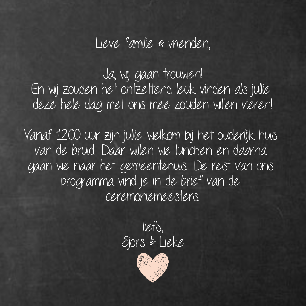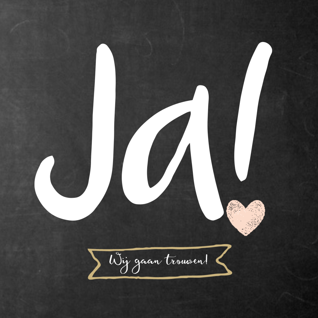 Deze trouwkaart met groot JA op de voorkant en krijtbord achtergrond kun je zelf aanpassen naar wens en smaak.