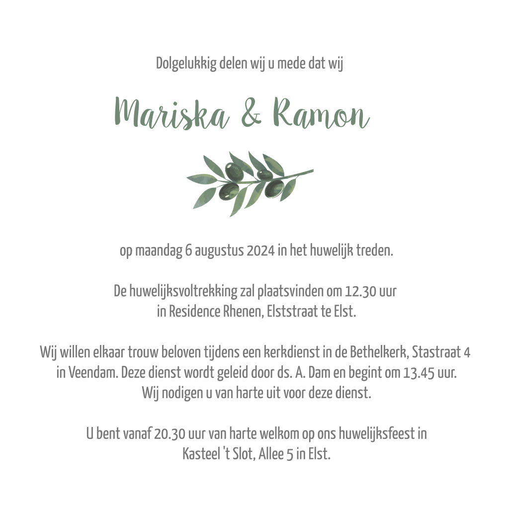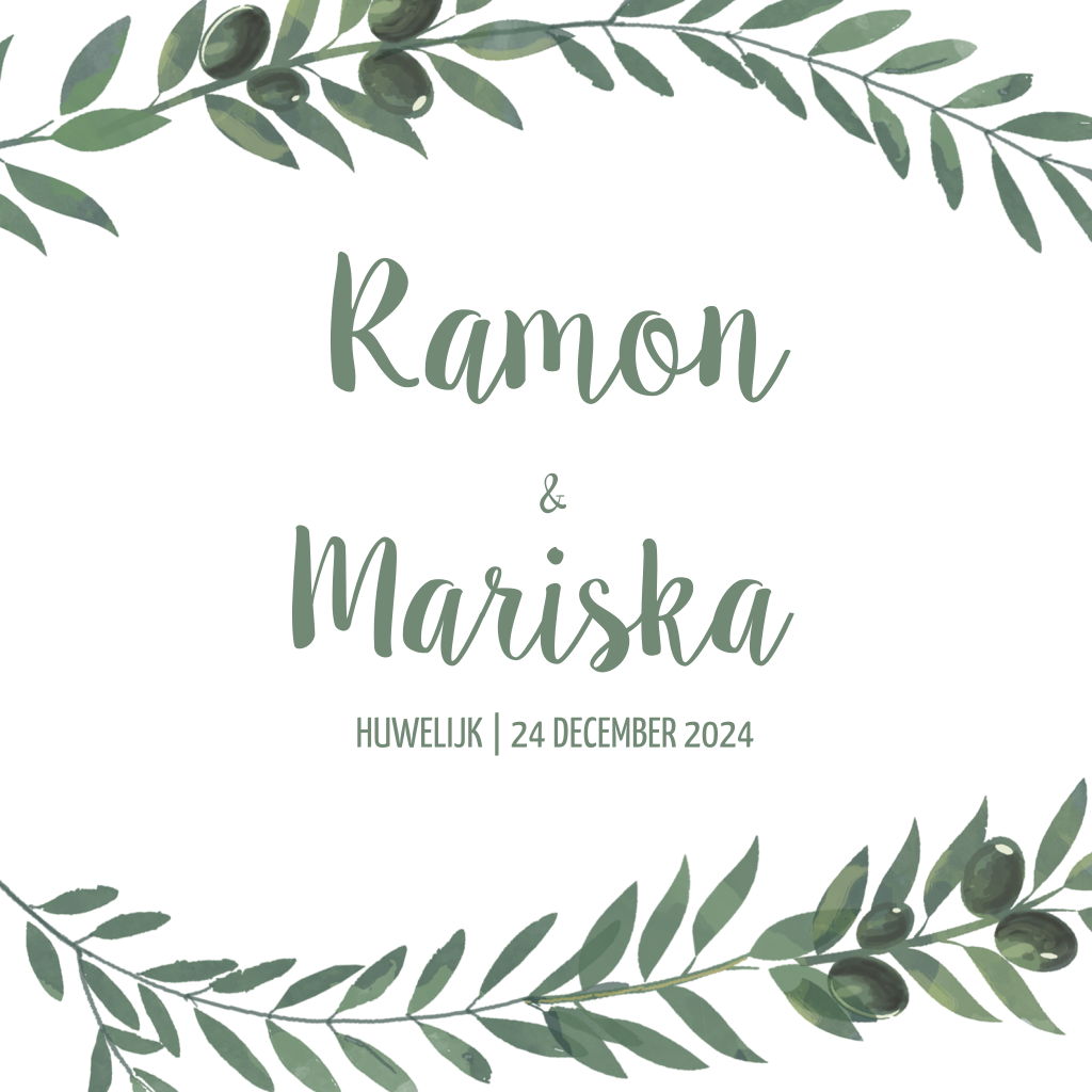Botanische trouwkaart met takjes van olijven. De tekst en de kleuren kunnen in de editor aangepast worden. Bekijk ook onze bijpassende save the date kaart en bedankaart.