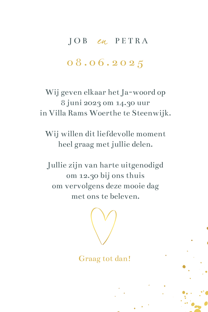 Hippe trouwkaart met goudkleurig hart op de foto