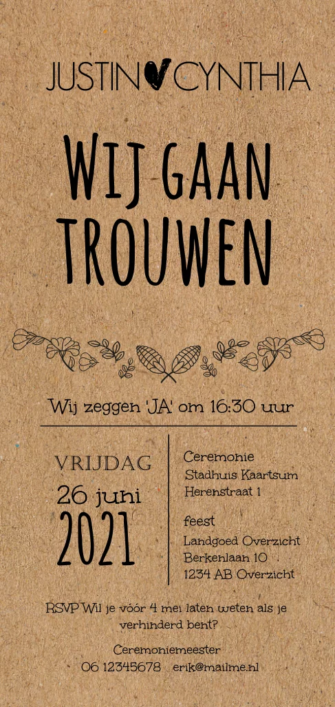 Deze trouwkaart met kraft-achtergrond heeft een hippe look. Speciaal zijn de tekeningen met zwarte pen van de blaadjes. Ook lief is het hartje tussen de namen bovenaan. Pas de teksten aan en maak hem af!