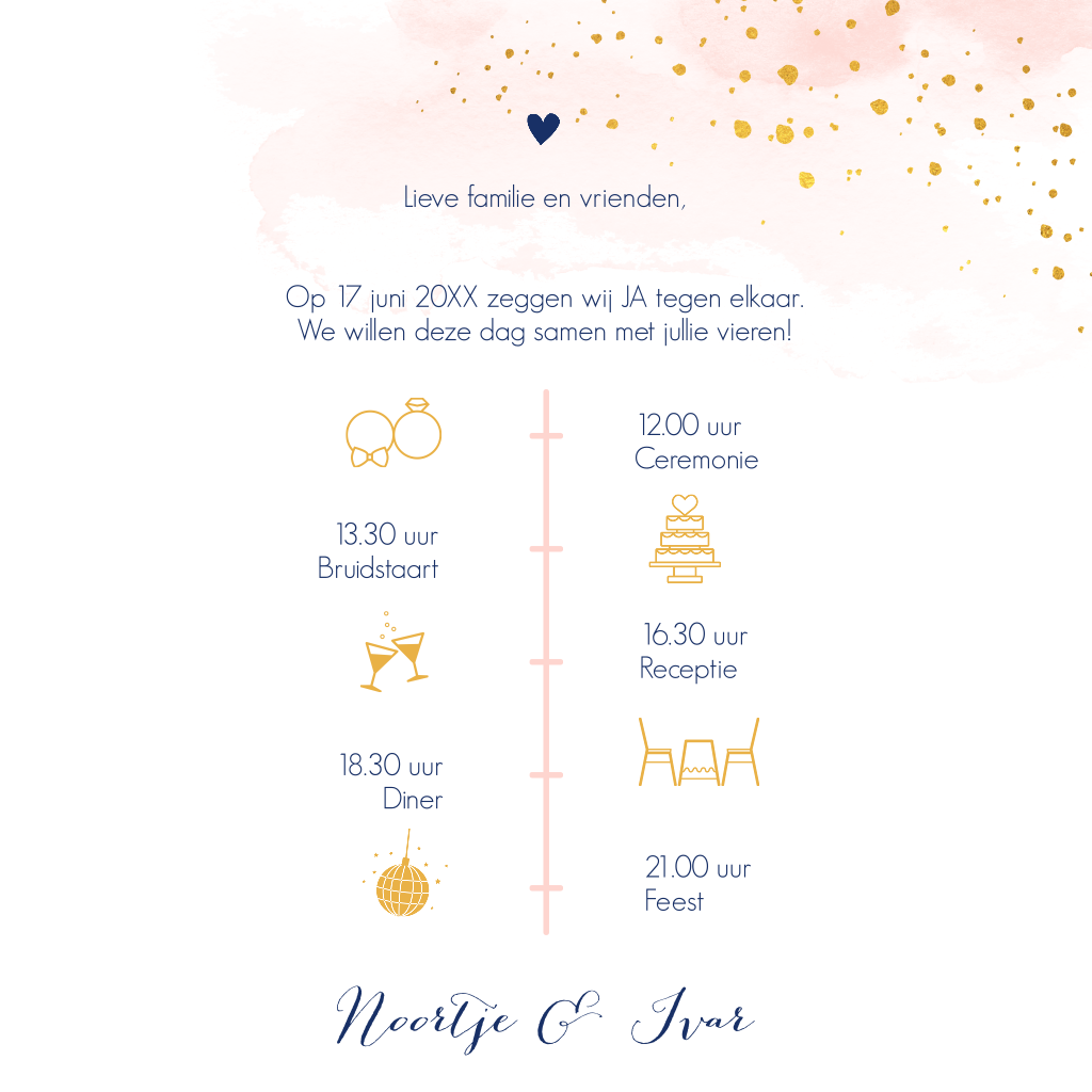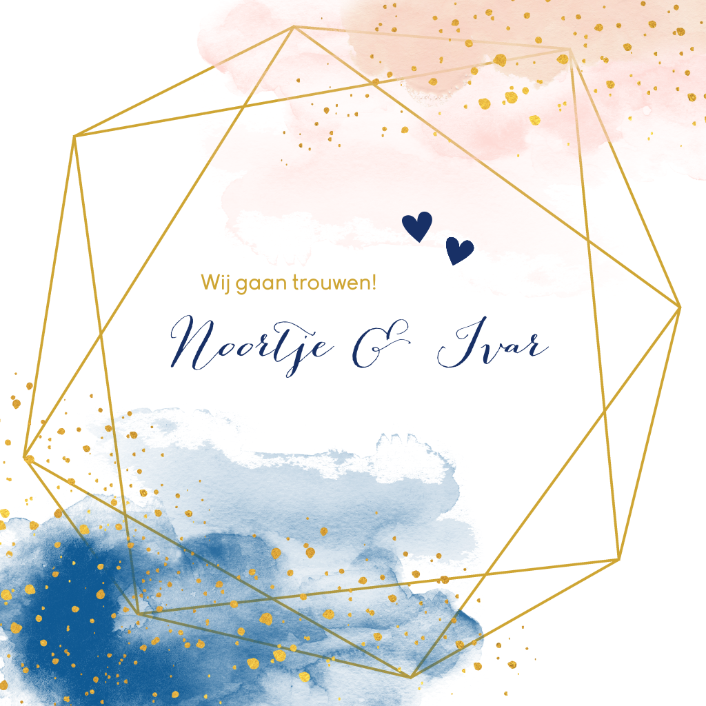 Mooie trouwkaart met grafische vorm in goudlook en blauwe en roze waterverf vlekken die je ook een andere kleur kunt geven.