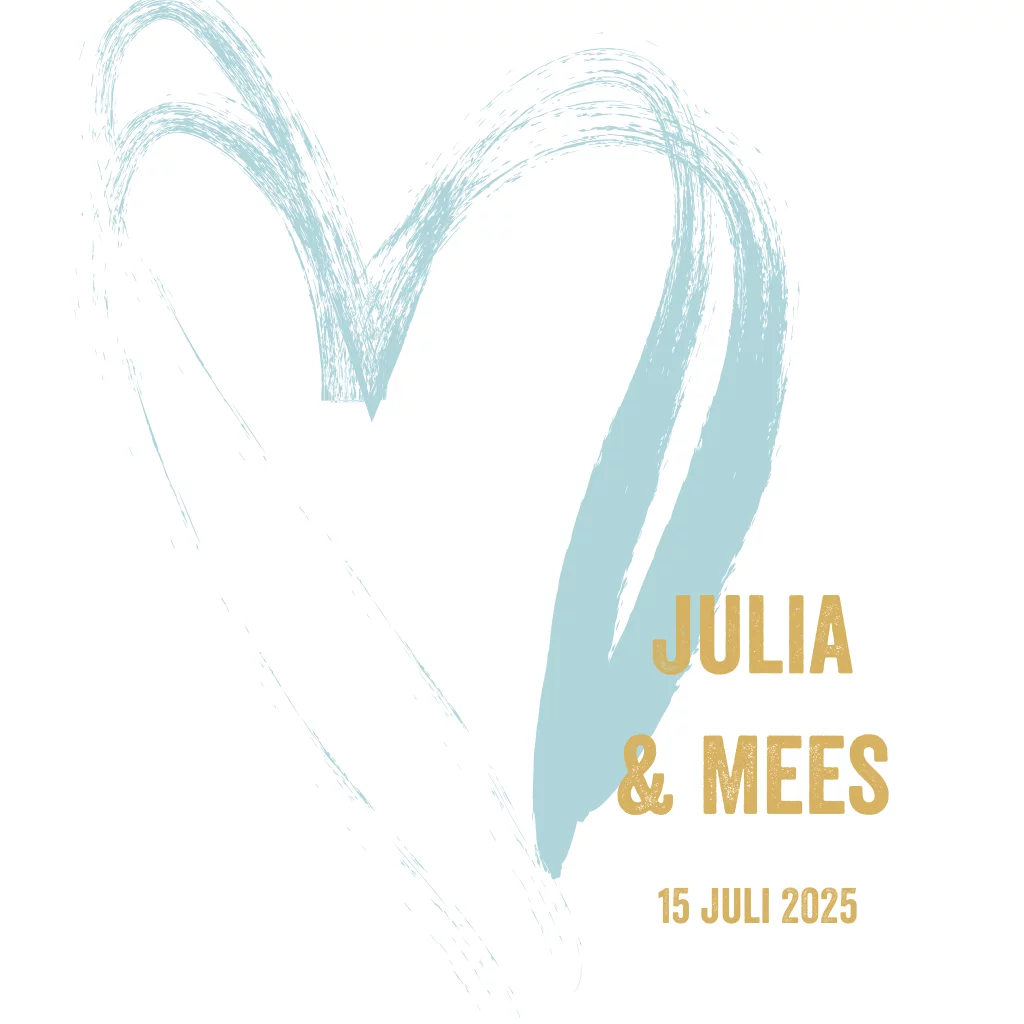 Stijlvolle trouwkaart met twee geschilderde harten in pastelblauw op een witte achtergrond. Verander eventueel zelf kleuren en lettertype naar eigen wens en maak je kaart uniek!