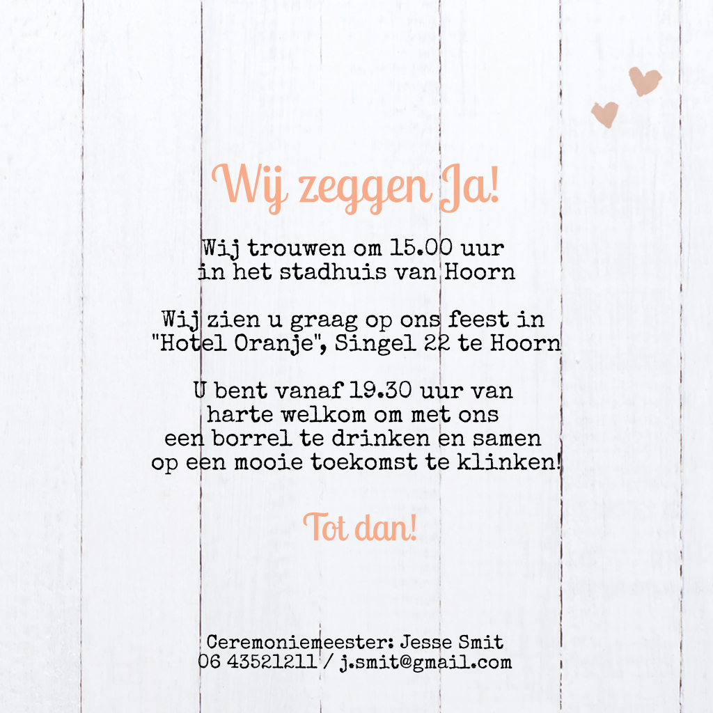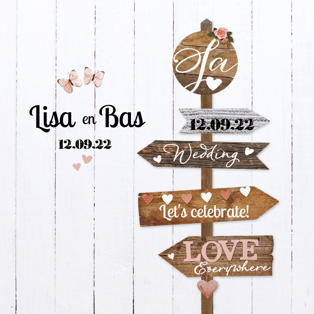 Een hippe en vrolijke trouwkaart! Het wegwijsbord en de achtergrond van witte, houten planken maken dit een hip kaartje. De kaart is gepimpt met hartjes, verschillende teksten, vlinders en een roosje. Ontworpen door Belarto.