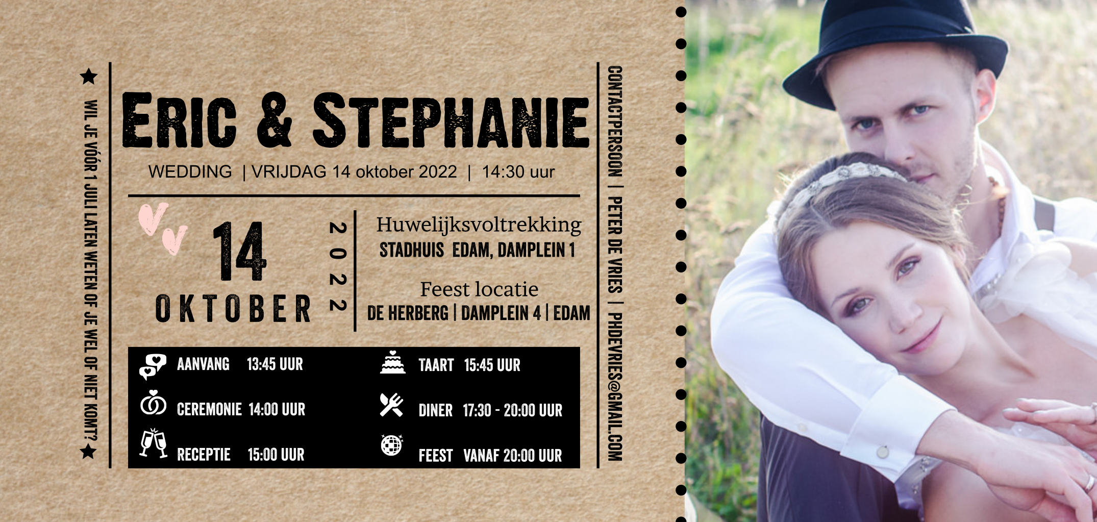 Hippe, panorama-trouwkaart van kraftkarton met eigen foto! De foto en het kraft worden gescheiden met zwarte stipjes. Ook leuk zijn de icoontjes met de tijden in het zwarte vlak. I wanna marry you!
