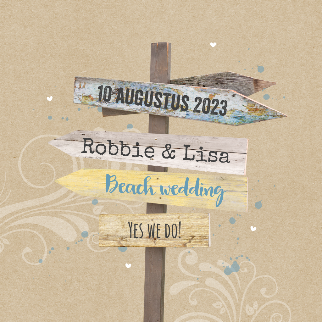 Originele uitnodiging voor jullie trouwdag met een hippe strandpaal met wegwijs bordjes. Kies zelf welke leuke teksten je op de wegwijzer zet.